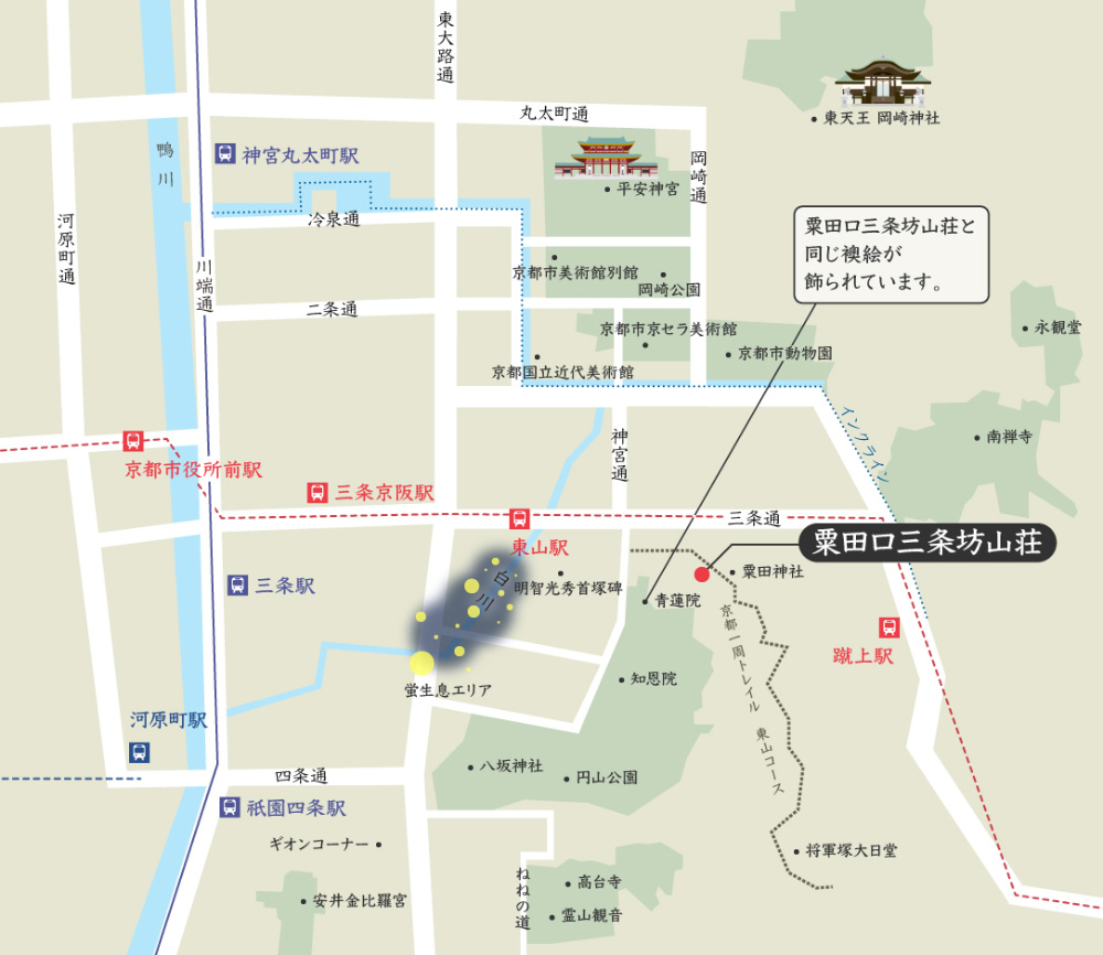 〒605ー0035京都府京都市東山区粟田口三条坊町2番21号市バス 5系統「三条神宮道」 徒歩約5分地下鉄東西線「東山駅」 1番出口 徒歩約5分