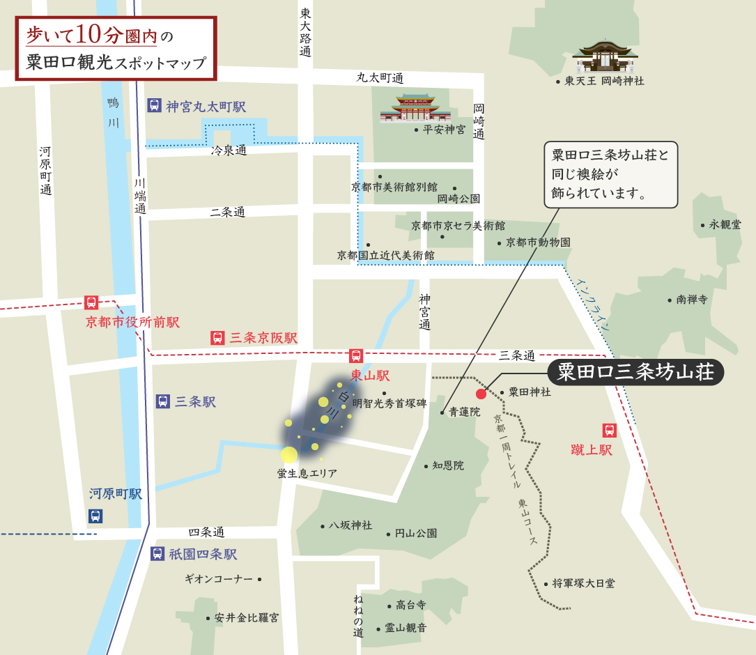 粟田口三条坊山荘から、国立近代美術館・京都市京セラ美術館・岡崎公園・平安神宮へ行くルートです。