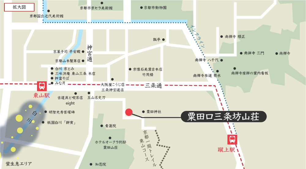 粟田口三条坊山荘から、白川沿いを歩き、新門前通り・古門前通りの骨董店を散策するルートです。
